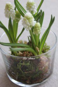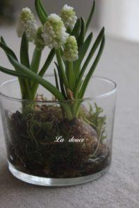 こちらは「ちょっとした手土産に」のオーダーにお作りしました、いや、これでは作るとは言えませんね・笑 ご用意差し上げたお品です。ムスカリちゃんをフランスで見つけた小さなガラスの器にセットしてラッピングしました。