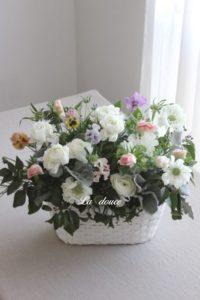 「白に優しい色を入れて」お供えのお花のご注文では一番多いご希望かもしれません。お供えのお花だけれどあまり寂しくならないようにと思われるご注文主様のお気持ち、とてもよくわかります。