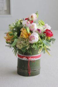 切り花セットは早春を感じさせる様な枝物・切り花をミックス(花内容はラドゥースへお任せいただきます)。これは花束になっていないのでお手持ちのフラワーベースに合わせて好きな様に楽しんでいただくことができますよ。お花の金額はご希望金額でお承りしていますが「それほど沢山じゃなくても…」でしたら¥3,000~4,000くらいから、「ちょっと豪華な感じがいいわ」ですと¥6,000くらいからがおすすめです。